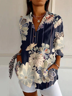 Japanese Traditional Style Floral Art Printed Women's Casual Cotton Shirt