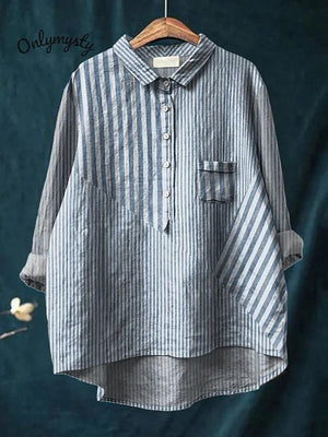 Stripe Art Printed Women's Casual Cotton And Linen Shirt