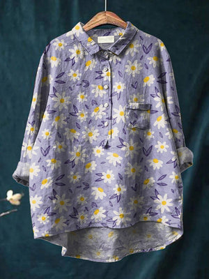 Sweet Daisy Repeat Pattern Printed Women's Casual Cotton And Linen Shirt