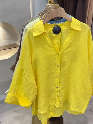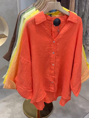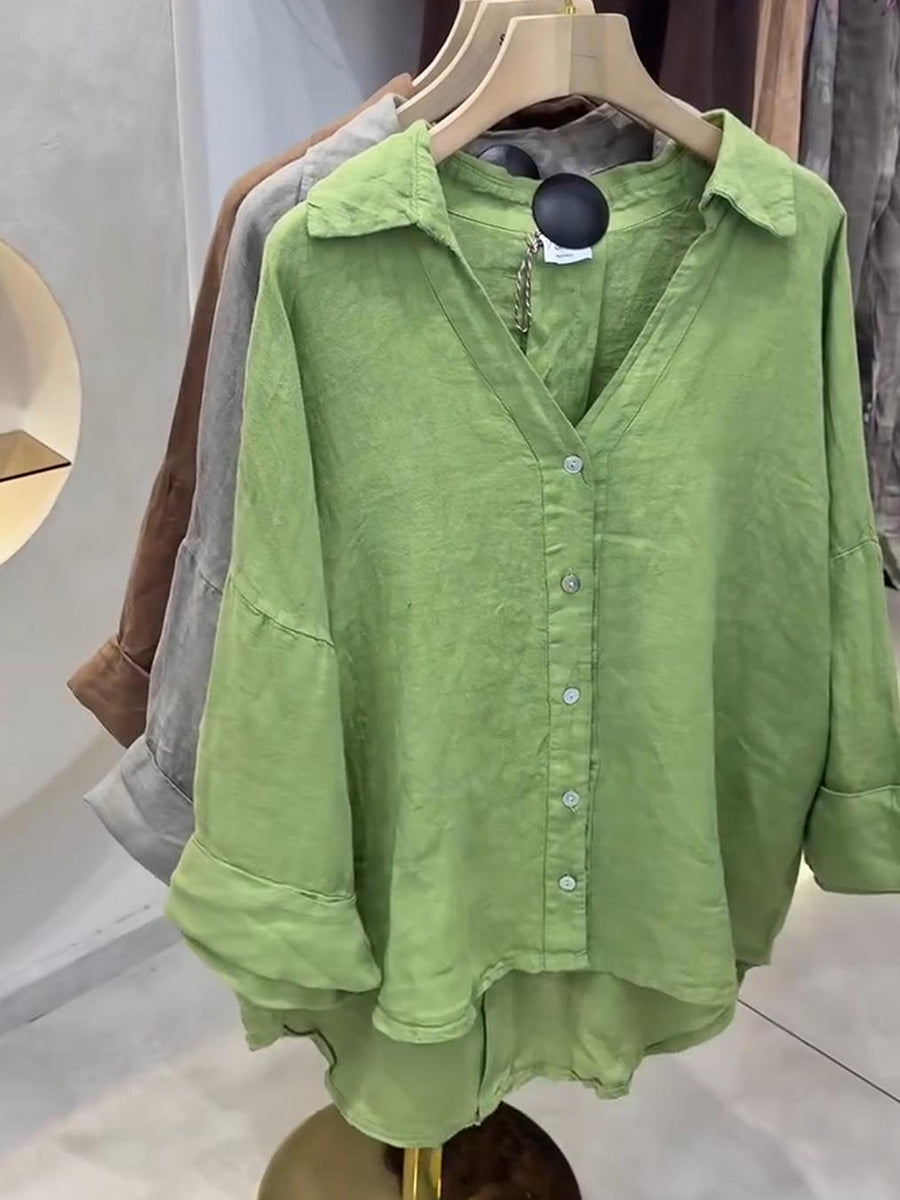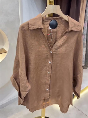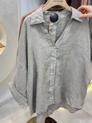 Women's Loose V-neck Batwing Sleeve Long-sleeved Linen Shirt