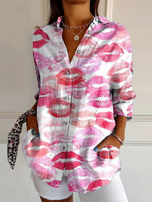 Women's Pink Lip Art Print Casual Cotton Shirt