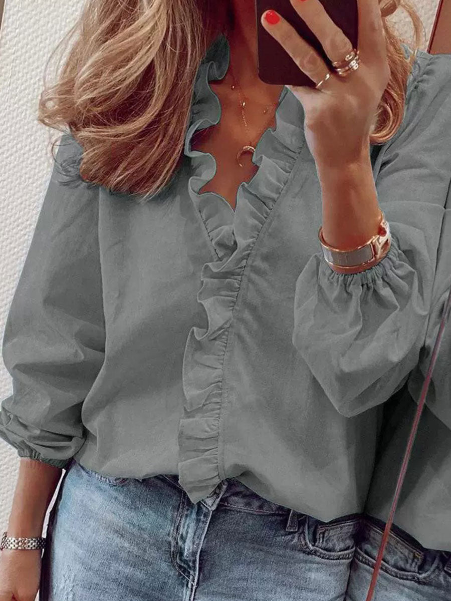 Women's Solid Color  Casual Cotton And Linen Ruffle Shirt