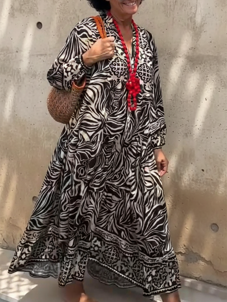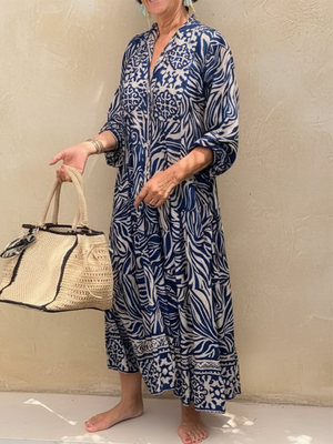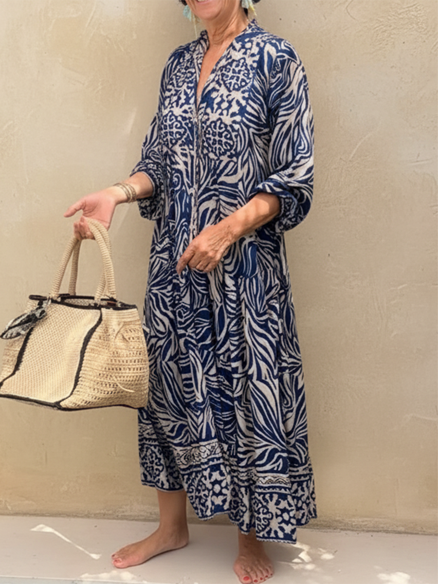 Elegant Shiny Floral Print V-neck Midi Cotton Dress