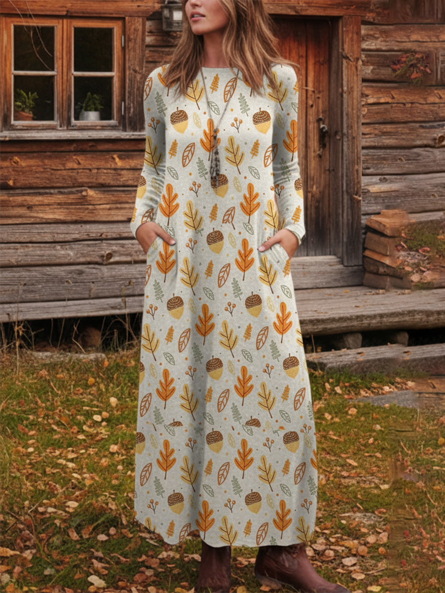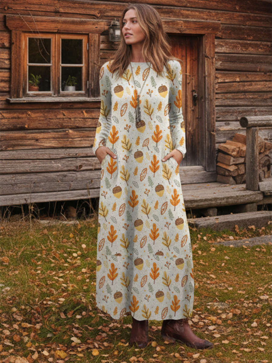 Forest Autumn Pine Cone Leaf Print Knitted Dress