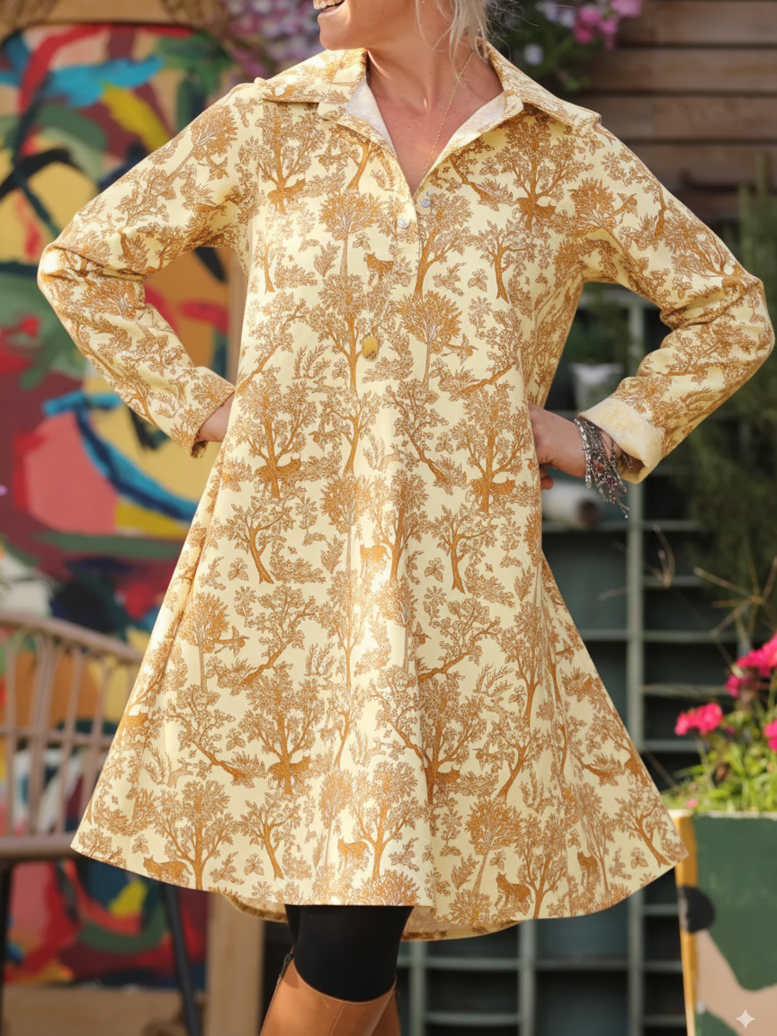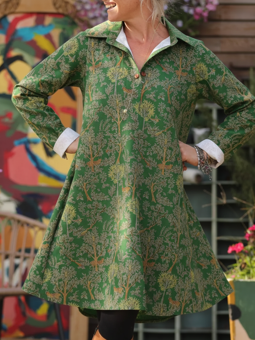 Forest Fairy Tale Autumn Tree Print Lapel A-Line Dress
