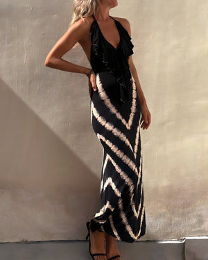 Stay effortlessly stylish with the Galina Dress, a perfect blend of sophistication and bohemian charm. Crafted with a flattering A-line silhouette, halter V-neck, and ruffle drape front, it enhances your waistline while ensuring all-day comfort.