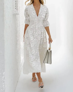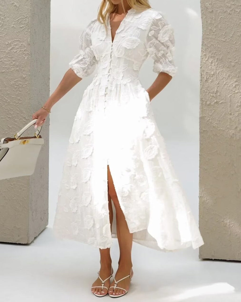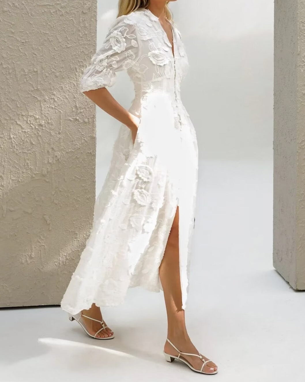 This elegant Lindelle Dress is the perfect addition to any party wardrobe. Its luxurious embroidery and stylish V-neck design exude sophistication, while the single-breasted split adds a touch of modern flair. Make a statement and turn heads with this stunning dress.