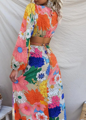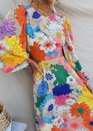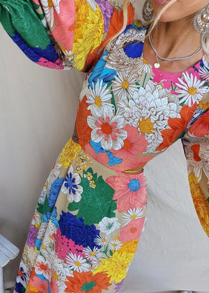Step into a dream of color with the Maravilla Garden Dress ¨C a vibrant celebration of nature in full bloom. Made from 100% recycled polyester, this maxi dress features bold floral prints in joyful hues and a flattering silhouette with long puff sleeves and a graceful skirt. The side cut-out and tie-back detail add a playful twist, perfect for garden parties, beach getaways, or wherever your boho spirit takes you.