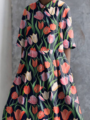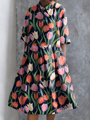 Tulip Floral Repeat Pattern Printed Women's Pocket Cotton Dress