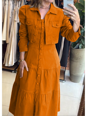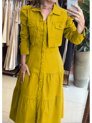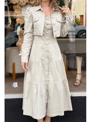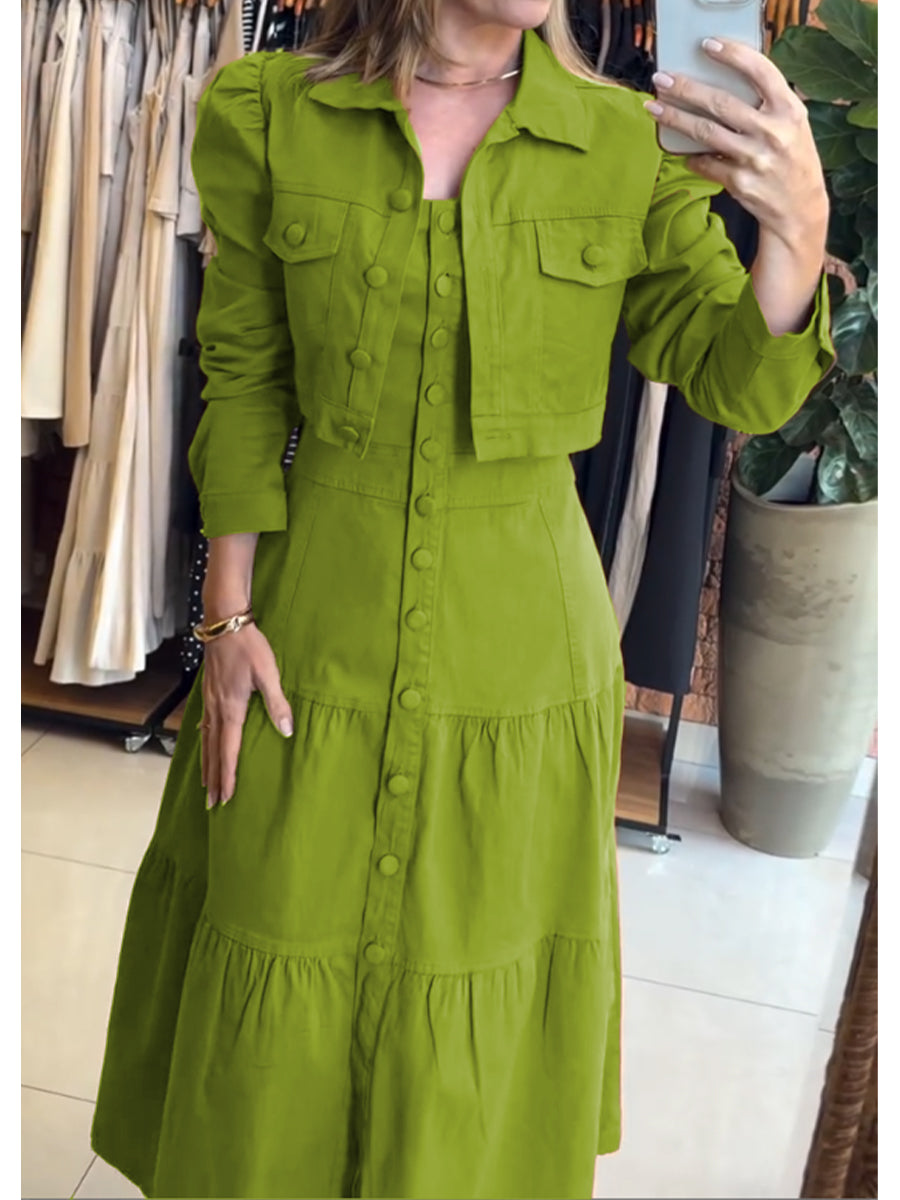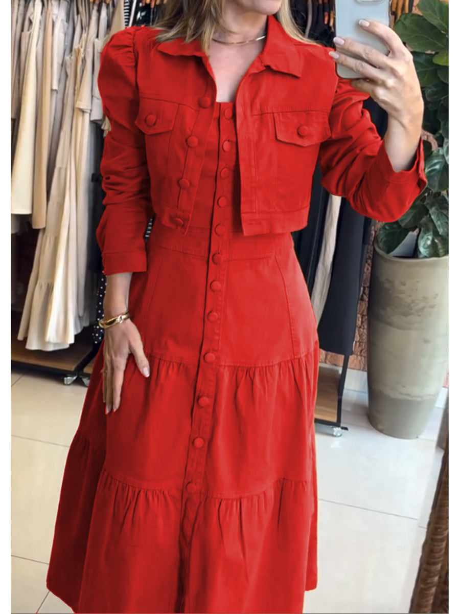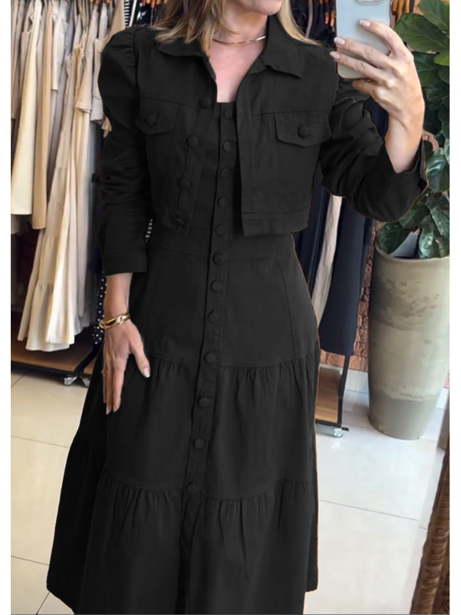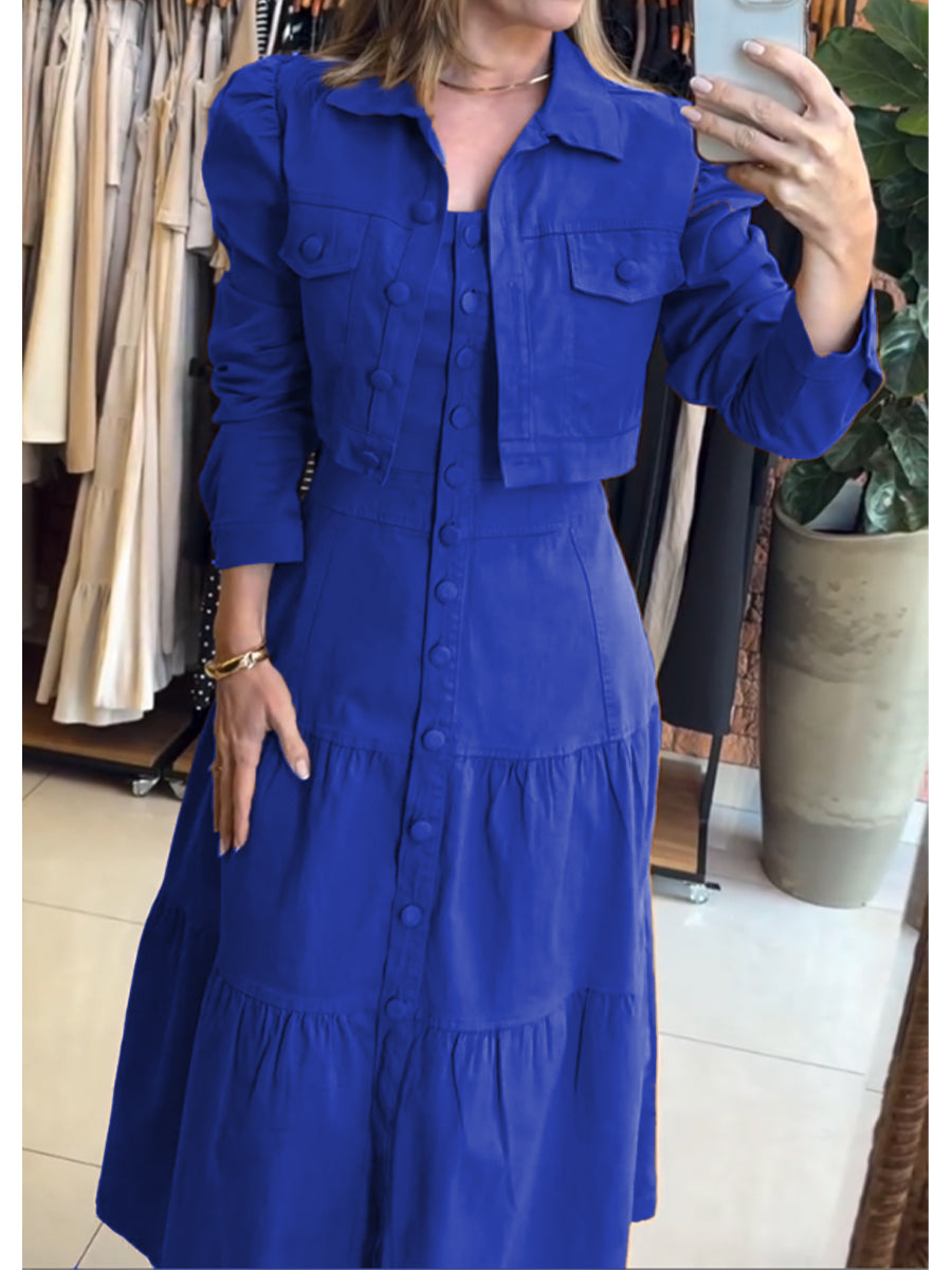 Women's 100% Cotton Cropped Puff-sleeved Jacket and Slip Dress Two-piece Set