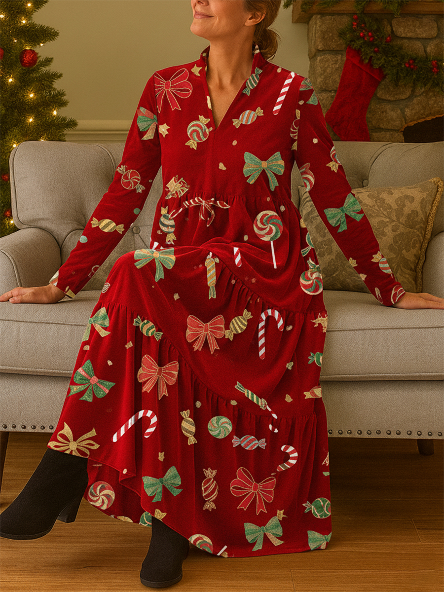 Women's Cute Candy Bow Print Velvet V-neck Midi Dress