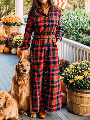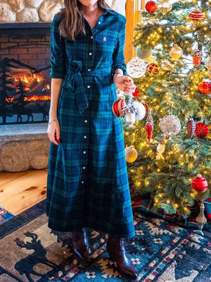 Women's Plaid Print Long Sleeve Casual Loose Cotton Dress