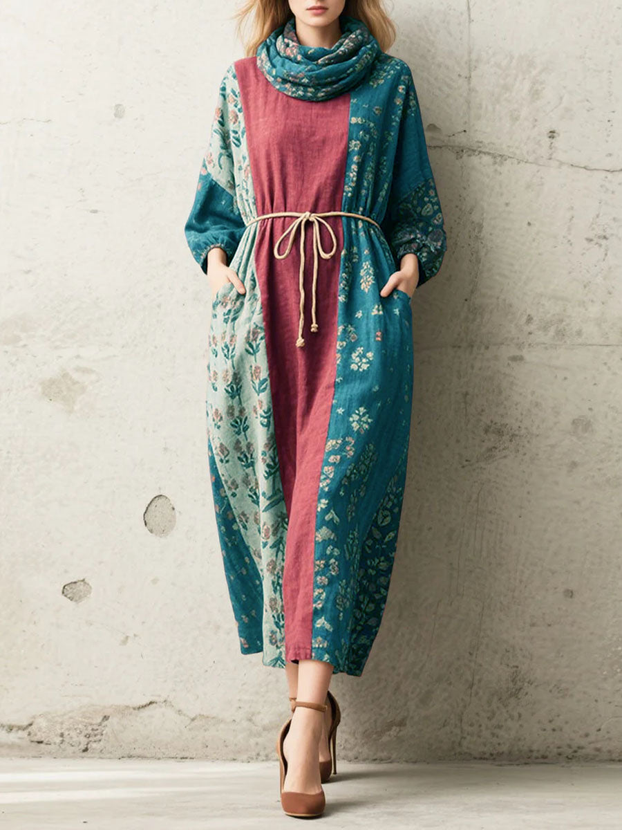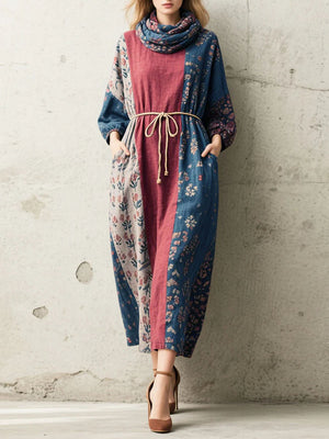 Women's Retro Floral Turtleneck Long Sleeve Casual Loose Linen Dress