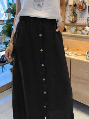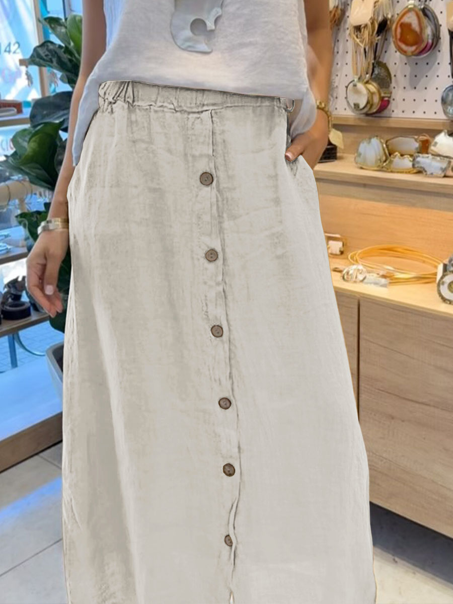 Women's Solid Color Elastic Waist Buttons Casual Pockets Linen Skirt