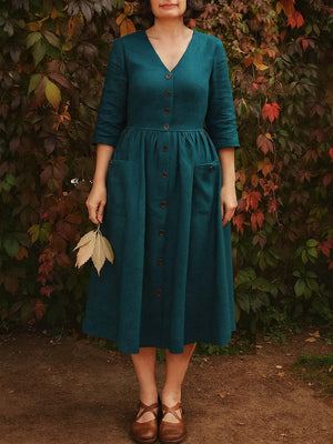 Women's Solid Color V-Neck 3/4 Sleeve Casual Loose Cotton and Linen Dress