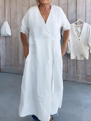 Women's Solid Color Wrap-around Tie Pocket Linen Dress