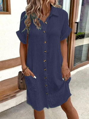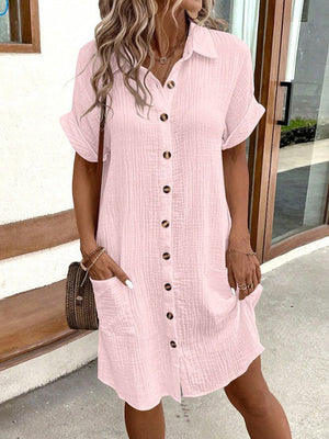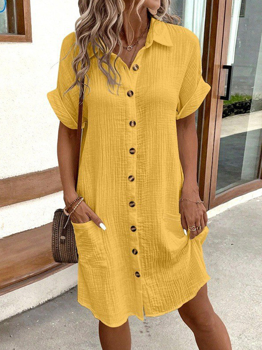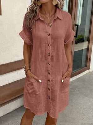 Women's Summer Simplistic V-Neck Button Down Cotton And Linen Shirt Dress