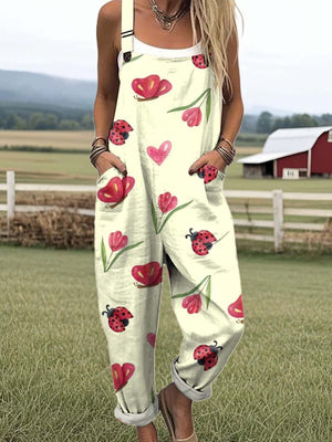 Women's Lovely Floral Insects Art Print Casual 100% Cotton Wide Leg Jumpsuit