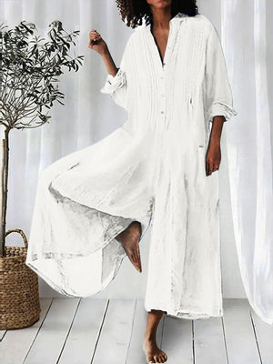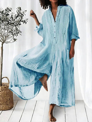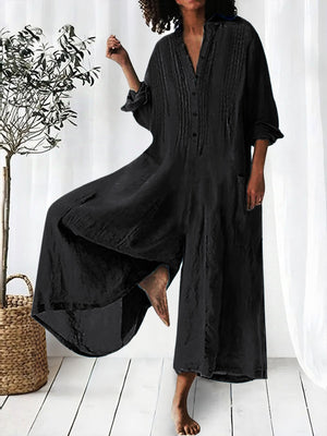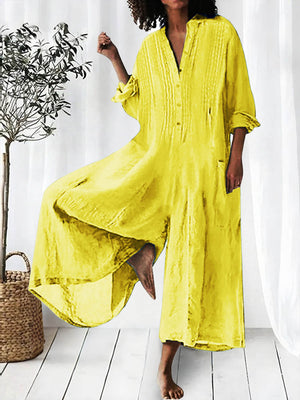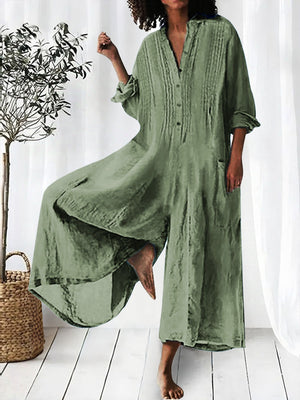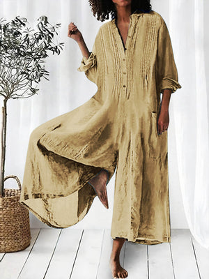 Women's Solid Lapel Long Sleeve Casual Linen Wide Leg Jumpsuit