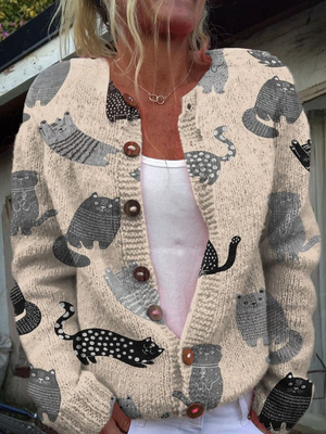 Decorative Pattern with Cute Cats Playing Buttoned Cardigan Sweater