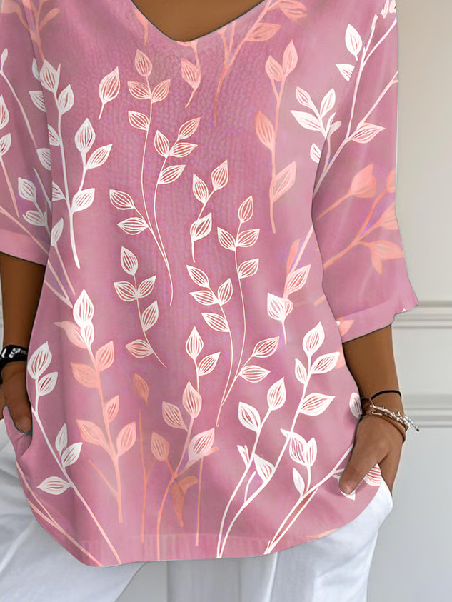 Casual Leaves Art Print V Neck 3/4 Length Sleeve T-shirt