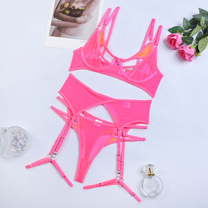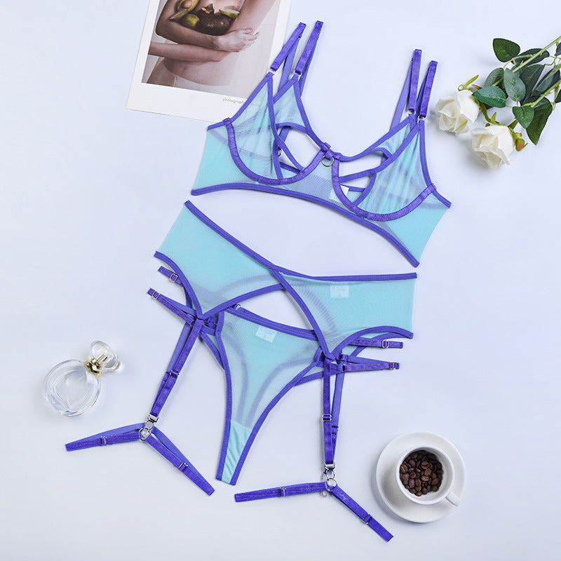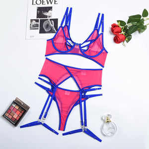 This lingerie set is at the top of our hit-list. Featuring a triangle cut out bra with adjustable straps, thong fit bottoms and a suspender belt in red embroidered material, we are totally obsessed.