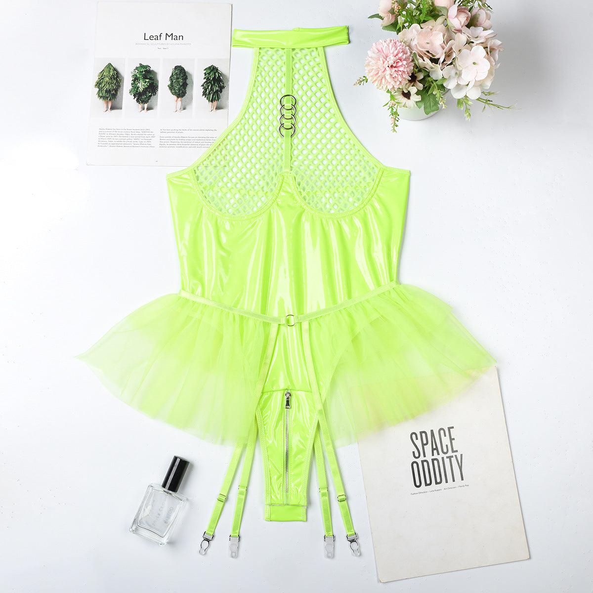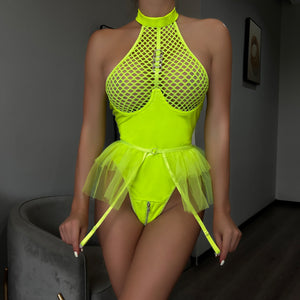 Home Mesh Ruffle Trim Garter Teddy Bodysuit