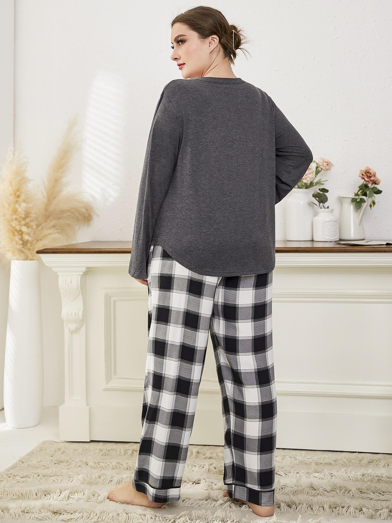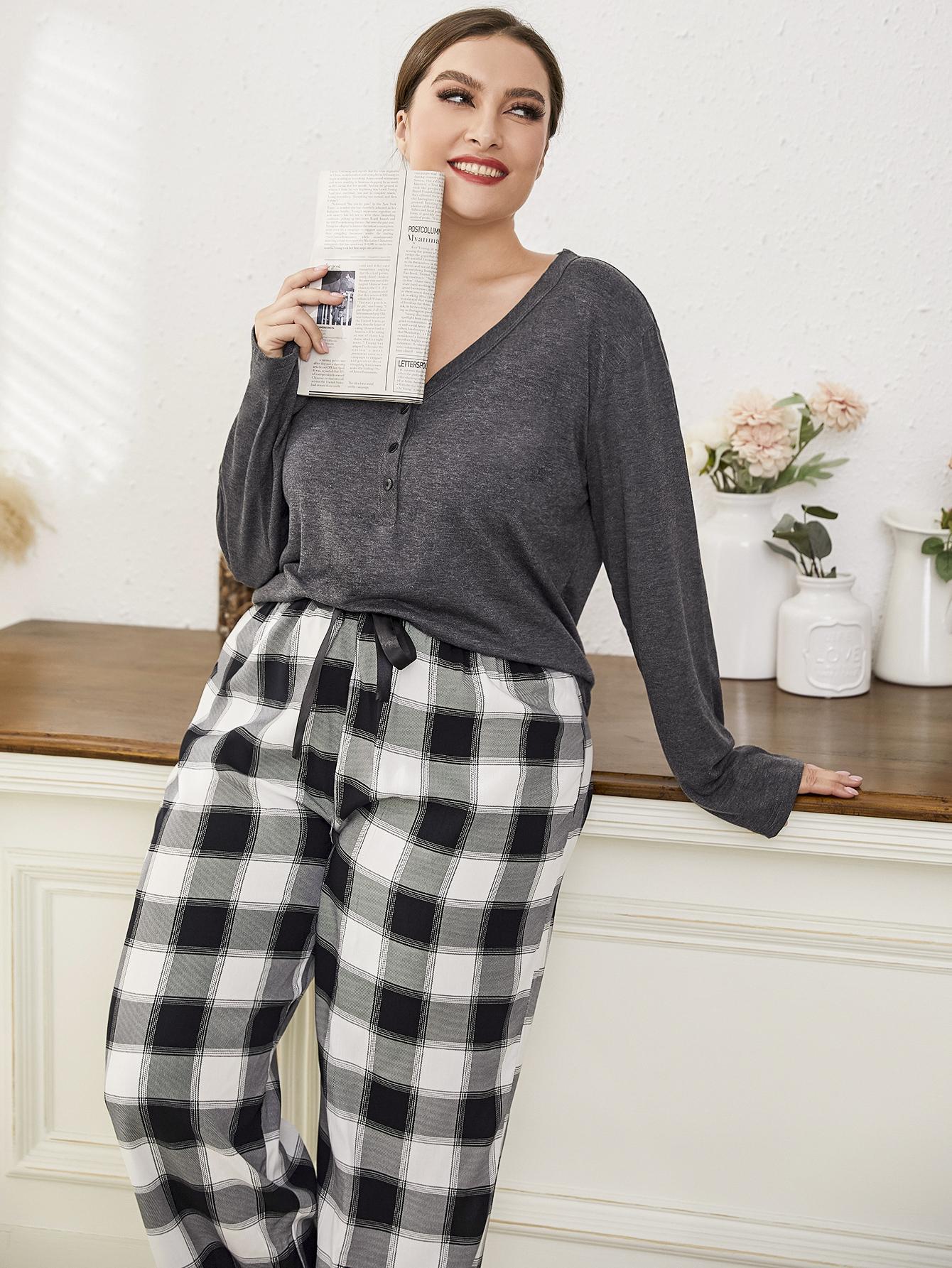 Plus Button Front Top & Buffalo Plaid Pants PJ Set