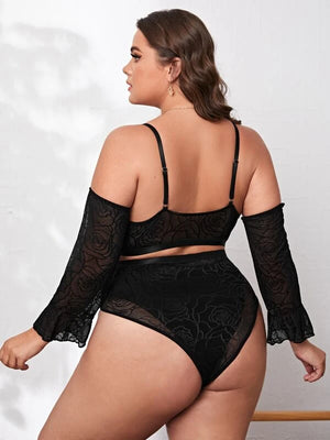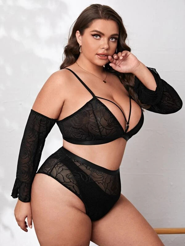 Plus Sheer Mesh Harness Lingerie Set With 1pair Oversleeves