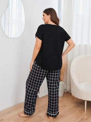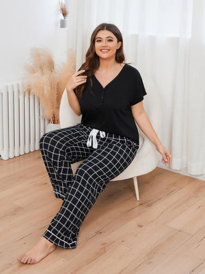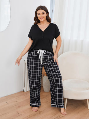Plus V-Neck Top and Plaid Pants Lounge Set