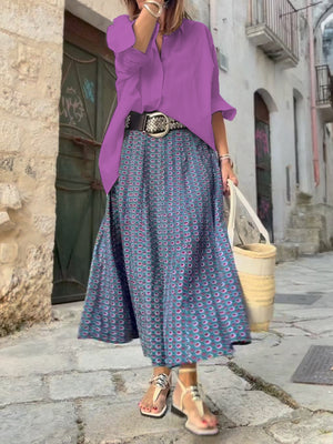 Women's Solid Color Cotton and Linen Long-sleeved Shirt and Gorgeous Retro Printed Skirt Two-piece Set