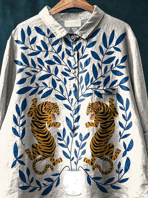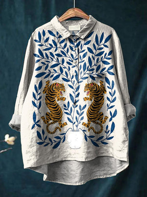 Tiger And Tree Symmetrical Graphic Printed Women's Casual Cotton And Linen Shirt