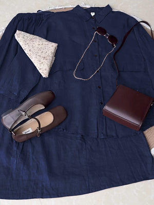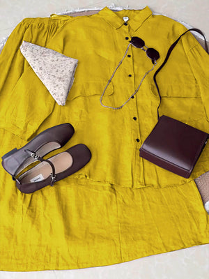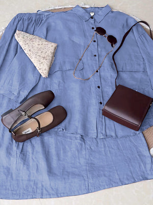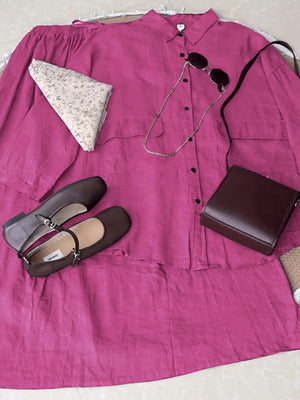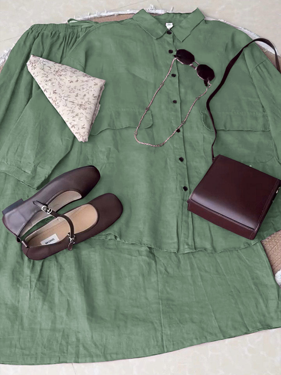 Women's Lapel Three-quarter Sleeves Solid Color Loose Tops Elastic Waist Casual Tie Skirt Set