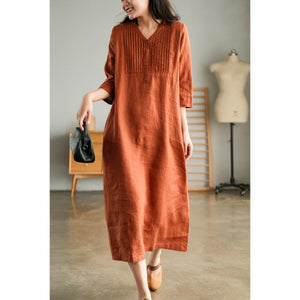 Summer Cotton Linen Midi Dress ¨C Stylish, Youthful, Casual V-Neck Pleated Long Dress, Lightweight & Over-the-Knee