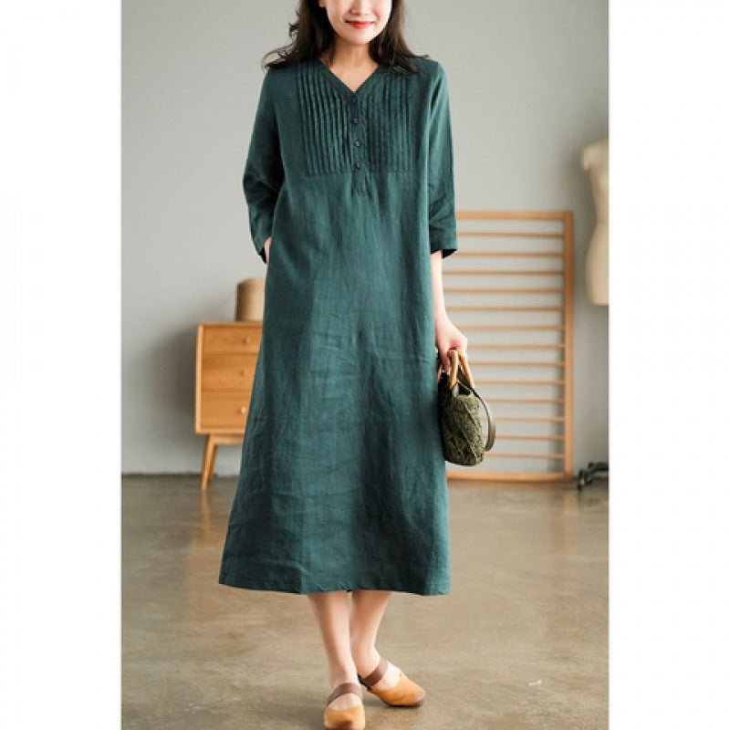 Home Dress Summer Cotton Linen Midi Dress ¨C Stylish, Youthful, Casual V-Neck Pleated Long Dress, Lightweight & Over-the-Knee