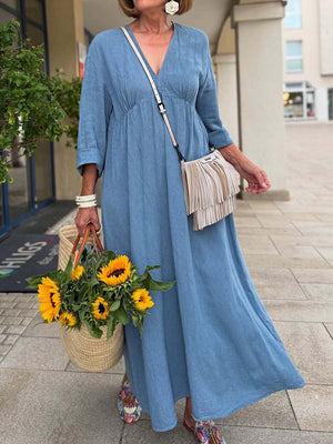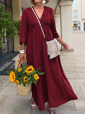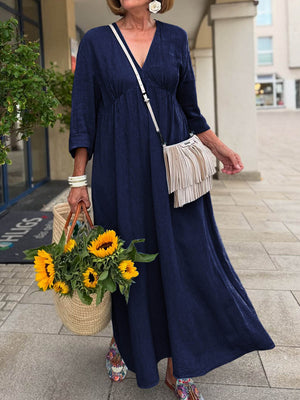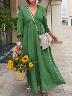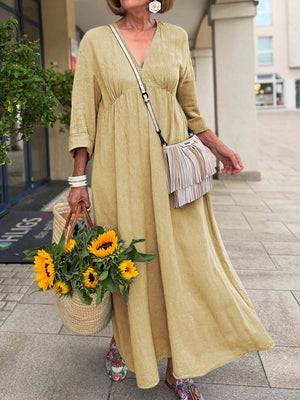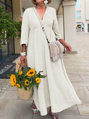 Women's Solid Color V-Neck 3/4 Sleeve Casual Cotton and Linen Loose Dress
