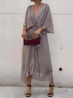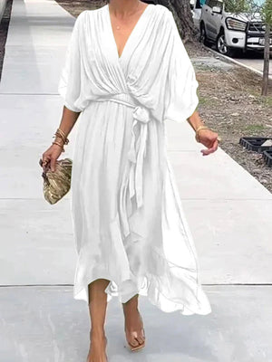 Women's Solid Color V-Neck Batwing Sleeve Casual Tie-up Ruffled Flowing Chiffon Dress