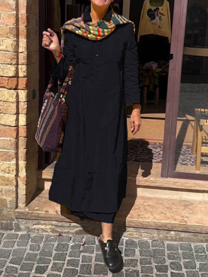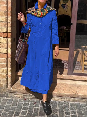 Women's Solid Color Shirt Collar Long Sleeve Casual Loose A-Line Cotton Dress