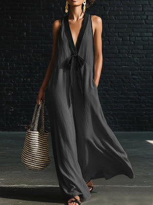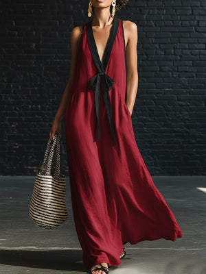 Classic Elegant Color-blocked Tie-neck Maxi Dress
