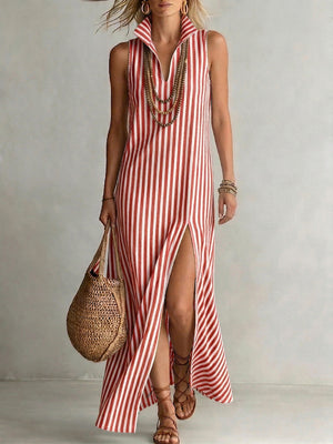 Stylish Classic Striped Stand-collar Cotton-linen Maxi Dress