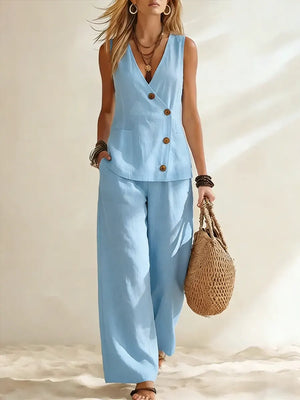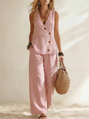 Women's Casual Minimalist Button-Decorated Cotton-Linen Wide-Leg Pants Set