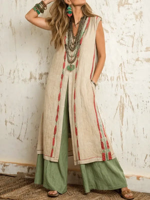 Women's Ethnic Comfortable Loose Sleeveless Top + Pants Cotton Linen Two-piece Set
