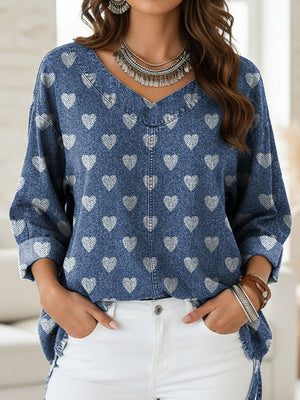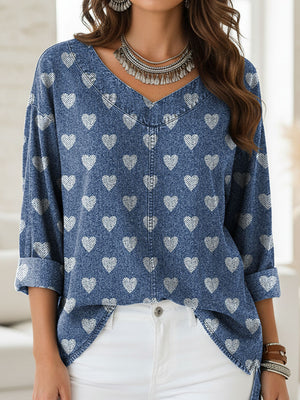 Women's Heart Pattern Print Casual Denim Shirt