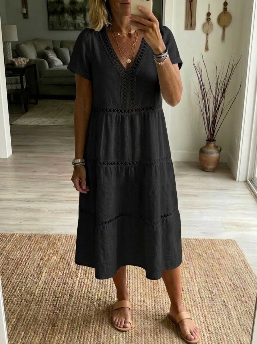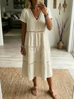 Casual Patchwork Openwork Ribbon Linen And Cotton Dress
