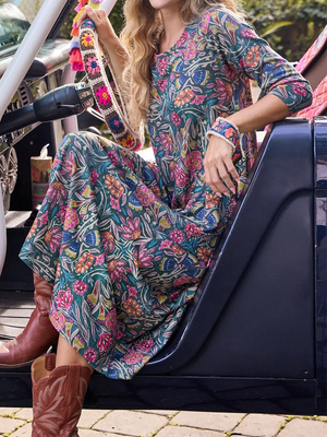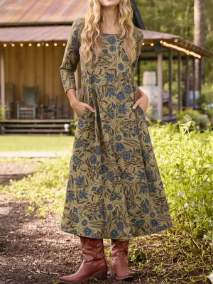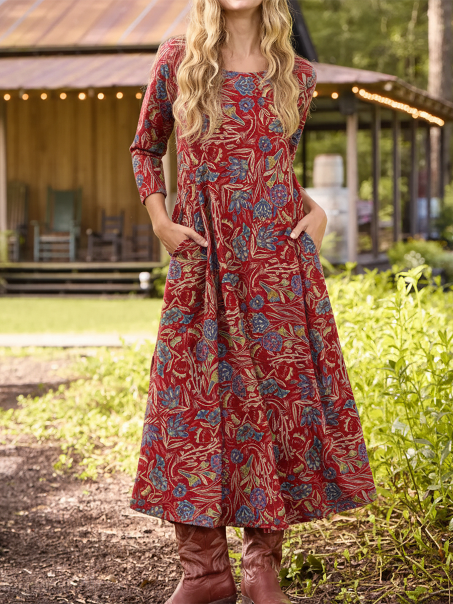 Bohemian Retro Pastoral Vine Print Knitted Stretch Dress