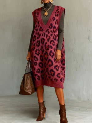 Women's Leopard Print V-Neck Sleeveless Casual Loose Vest Knit Dress