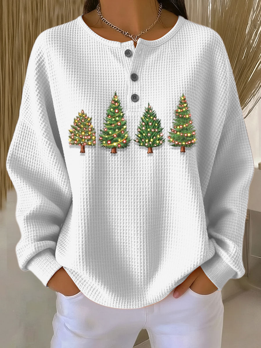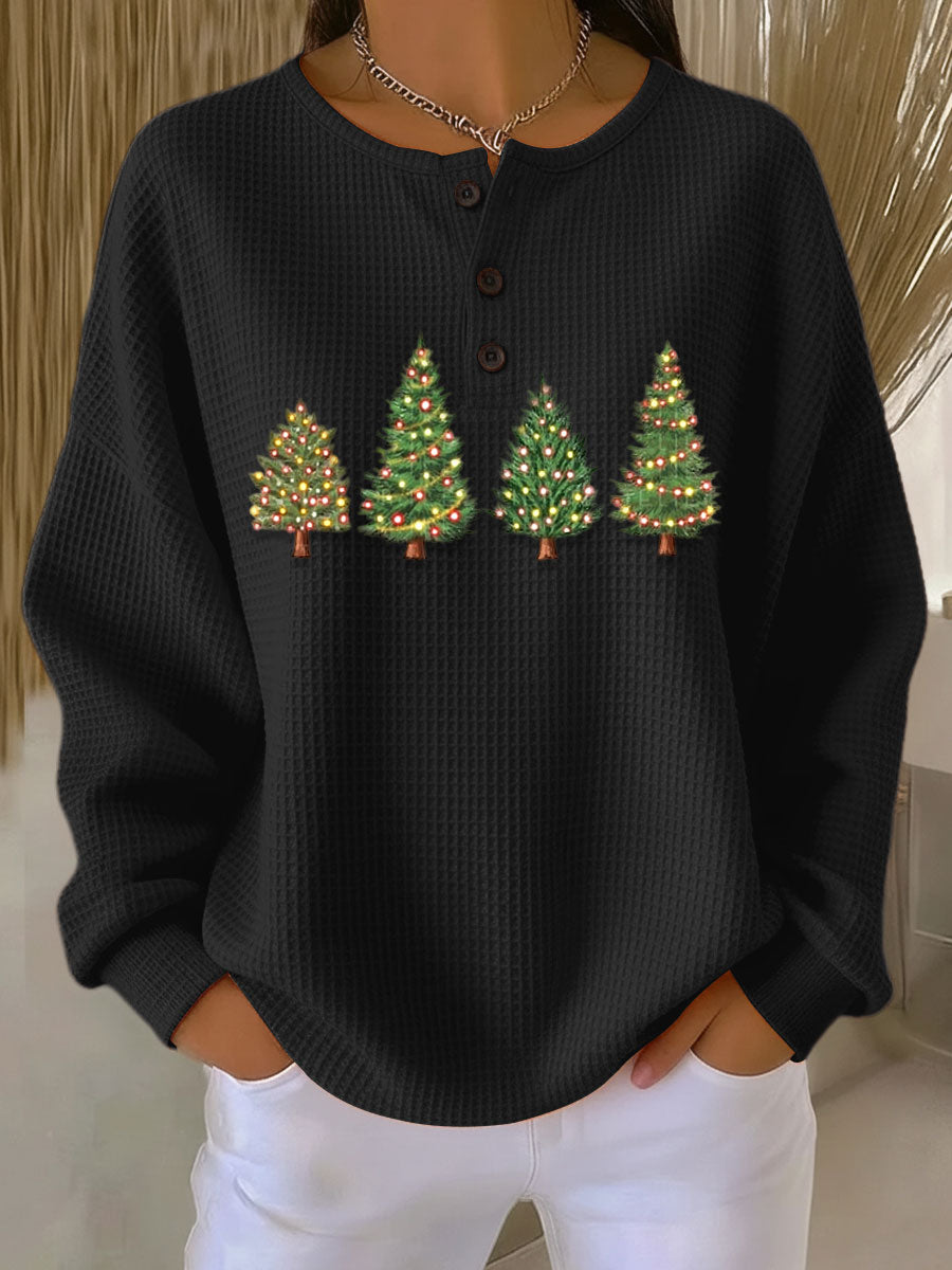 Women's Vintage Christmas Tree Art Print Casual Cotton Sweatshirt
